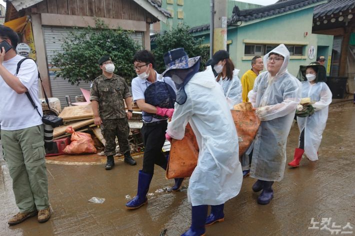 자원봉사자들이 구례5일장에서 폐기물을 나르고 있다.(사진=유대용 기자)