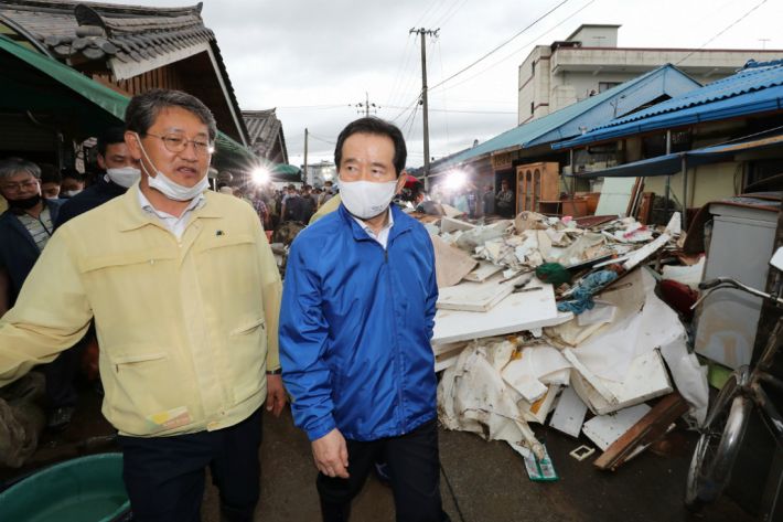 지난 10일 정세균 국무총리가 집중호우 피해 현장 점검으로 오후 전남 구례군 구례읍 구례 5일 시장을 찾아 침수 피해 및 복구상황을 둘러봤다.(사진=연합뉴스)