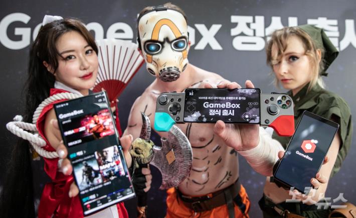 12일 오전 서울 광화문 KT스퀘어에서 게임 캐릭터 복장을 한 모델들이 KT의 구독형 게임서비스 '게임박스'를 시연하고 있다.