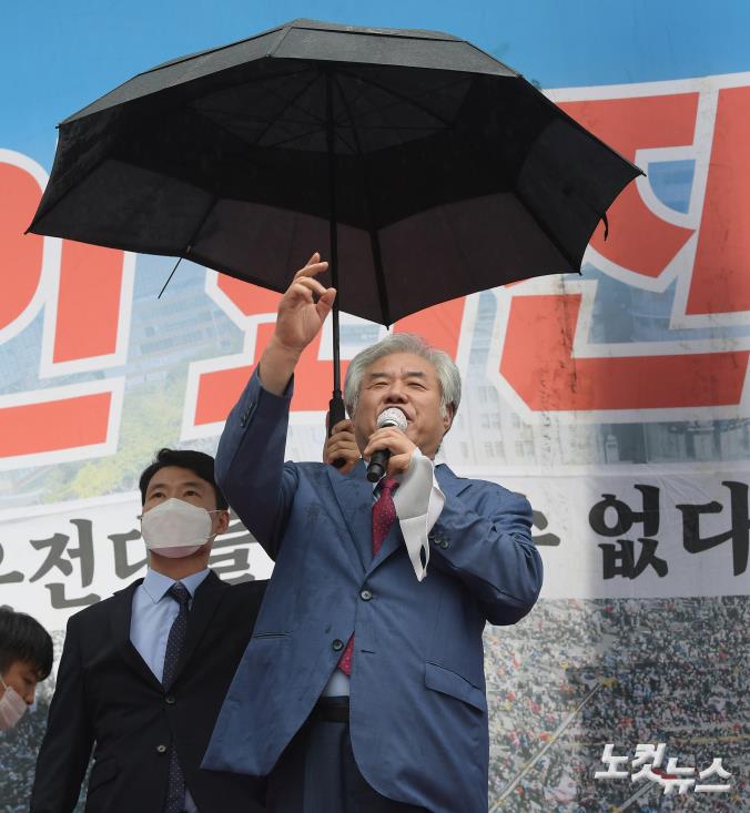 전광훈 목사가 15일 오후 서울 종로구 동화면세점 앞에서 열린 보수단체 광복절 집회에서 문재인 대통령 퇴진을 촉구하는 연설을 하고 있다..