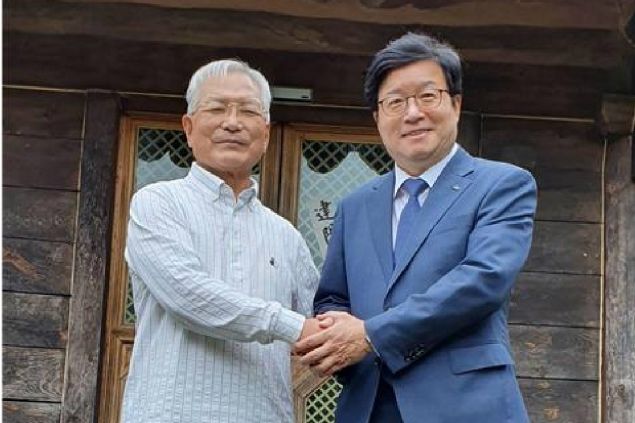지난 5일 문재인 대통령의 멘토로 불리는 부산교구 송기인(부산민주항쟁기념재단 이사장) 신부가 염태영 시장(오른쪽) 지지 선언을 했다.(사진=송기인 신부 제공)