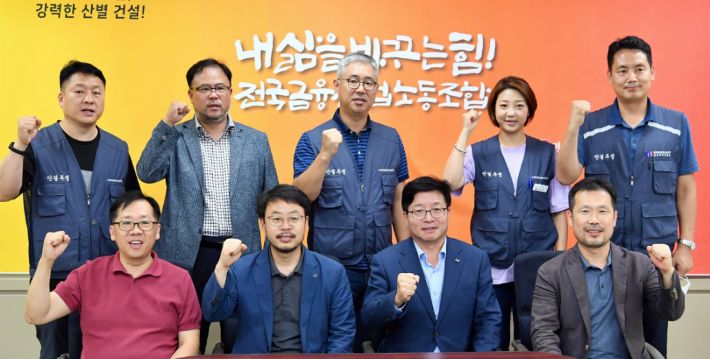 지난 14일 한국노총을 방문한 염태영(앞줄 오른쪽 두 번째) 시장과 금융노조 간부들이 간담회를 마치고 기념사진을 촬영하고 있다.(사진=염태영 더불어민주당 최고위원 후보 캠프 제공)