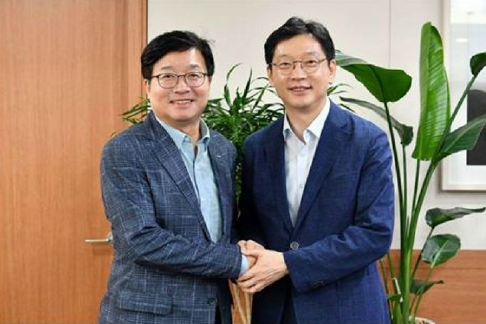 염태영 시장(왼쪽)이 지난 1일 경남도청을 방문해 김경수 경남도지사(오른쪽)와 도청에서 기념촬영을 하고 있다.(사진=염태영 더불어민주당 최고위원 후보 캠프 제공)