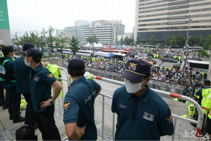 보수단체 집회 참가자들이 지난 15일 오전 서울 종로구 광화문광장에서 8·15 광복절 맞아 집회를 하고 있다.(사진=이한형 기자)