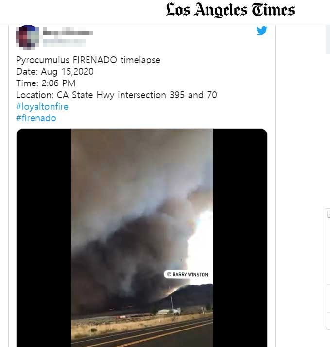 불(fire)과 토네이도(tornado)를 합성한 파이어네이도(firenado)는 대형 산불로 뜨거운 상승 기류가 만들어지면서 발생한다.