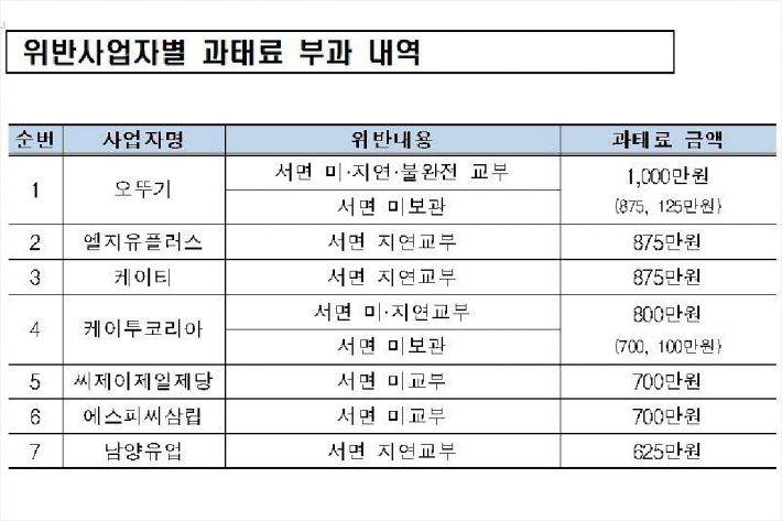 적발업체는 오뚜기(1천만원 부과), 엘지유플러스·케이티(875만원 부과), 케이투코리아(800만원 부과), 에스피씨삼립·씨제이제일제당(700만원 부과), 남양유업(625만원 부과) 등 7개 업체로 집계됐다.