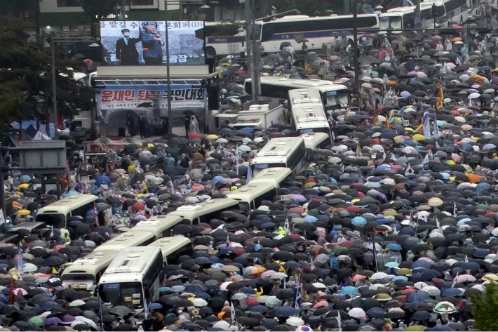 지난 15일 오후 서울 종로구 동화면세점 앞에서 열린 정부 및 여당 규탄 관련 집회에서 사랑제일교회 전광훈 목사가 발언하고 있다.(사진=연합뉴스)