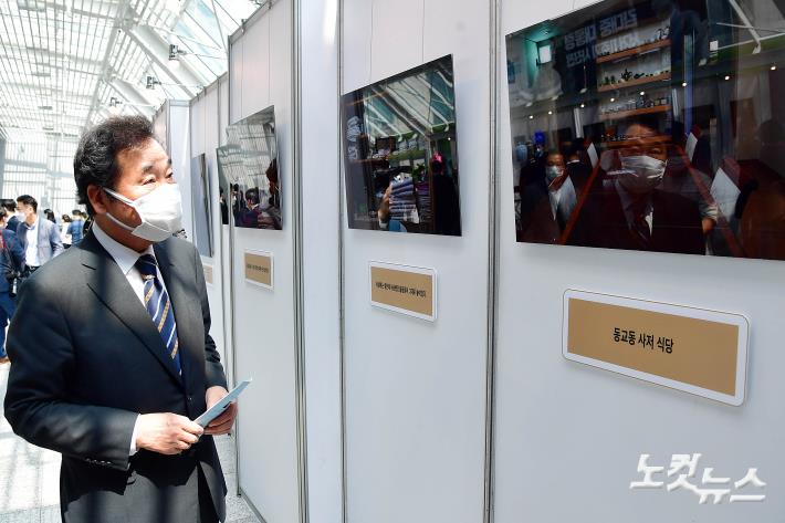 18일 오후 국회 의원회관에서 열린 '고 김대중 대통령 서거 11주기 사진전 개막식' 에서 더불어민주당 이낙연 의원이 사진을 살펴보고 있다.