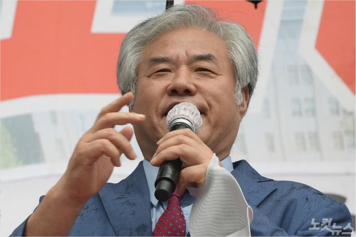 전광훈 목사가 지난 15일 오후 서울 종로구 동화면세점 앞에서 열린 보수단체 광복절 집회에서 문재인 대통령 퇴진을 촉구하는 연설을 하고 있다. (사진=이한형 기자/자료사진)