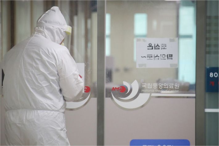 17일 서울 국립중앙의료원격리병상 입구에서 방호복을 입은 의료진이 들어가고 있다.(사진=연합뉴스)