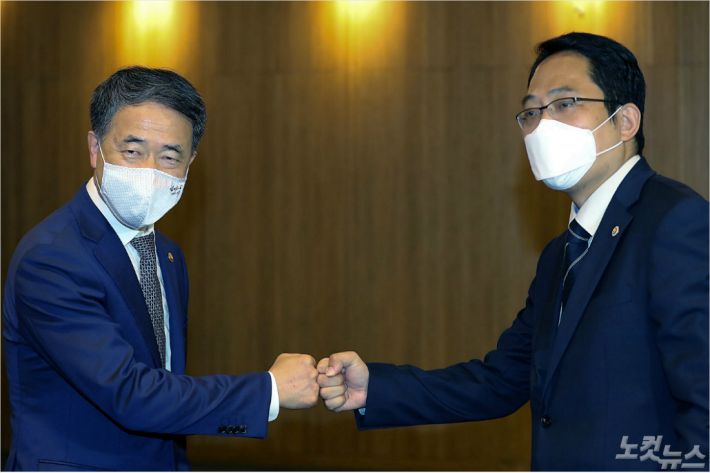 박능후 보건복지부 장관과 최대집 대한의사협회장이 19일 오후 서울 중구 코리아나호텔에서 열린 보건복지부-대한의사협회 긴급 간담회에서 주먹인사를 하고 있다. (사진=박종민 기자)