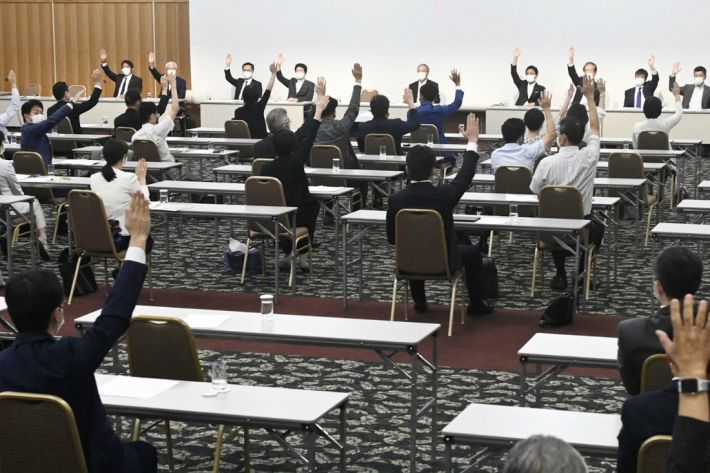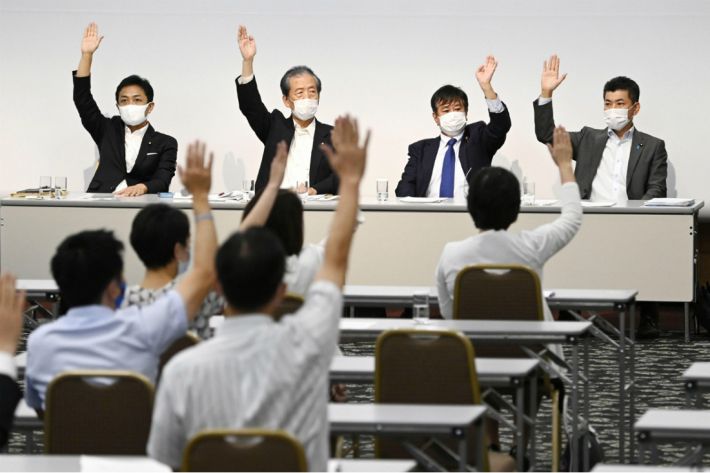 일본 야당인 국민민주당이 19일 도쿄 시내 호텔에서 의원 총회를 열어 당을 해산한 뒤 제1야당인 입헌민주당과의 신당을 만들기로 하는 안건을 거수표결하고 있다. (사진=연합뉴스)