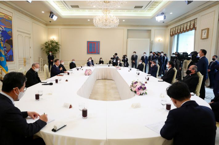 이날 천주교 지도자들과의 만남은 문 대통령이 지난해부터 각 종교 지도자들과 간담회일정을 가져온 데 따른 것이다. 당초 지난해 7월 한국 교회와 불교에 이어 천주교 지도자들과의 간담회도 가질 예정이었지만, 긴급 일정 등이 잡히면서 3번이나 연기됐다가 이번에 성사됐다.