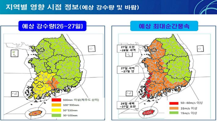 기상청은 제주도와 전라 서해안을 중심으로 최대 순간 풍속이 시속 180~216㎞(초속 50~60m)에 이를 것이라고 예보했다. 바람에 나무가 뽑히고 배가 뒤집히는 것은 물론, 큰 철탑도 휠 정도로 매우 강한 바람이다. 기상청은 "강수보다 강한 바람 피해가 우려되는 상황이다"라며 "건물과 공사현장, 옥외 간판 등 시설 관리와 안전사고, 농작물 피해에 각별히 주의해달라"고 밝혔다.
