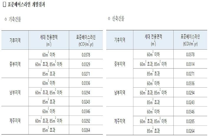 기축건물과 신축건물은 중부와 남부, 제주의 기후지역 분류와 전용면적 등에 따라 상이한 표준베이스라인을 갖게되는 것이다.