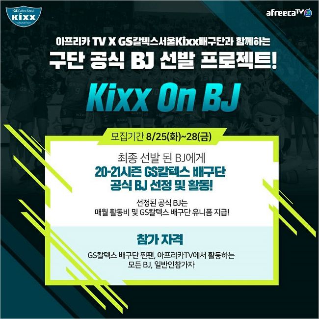 GS칼텍스는 구단 편파 중계방송의 전문성과 팬과의 소통을 강화하기 위해 '공식 BJ 선발 프로젝트 Kixx on BJ'를 개최한다.