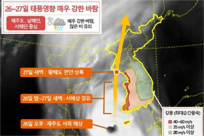 26일 오후를 기해 태풍 예비 특보가 내려진 대전, 세종, 충남 지역에는 27일까지 최대순간풍속 시속 126km 이상(초속 35m)의 매우 강한 바람이 불겠다.
