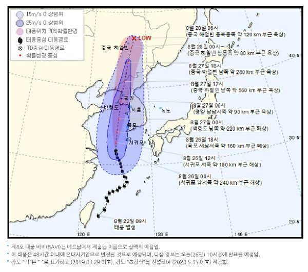 26일 기상청에 따르면 경북 동해안은 서해안에 비해 태풍의 영향은 작게 받겠지만, 초속 20km이상의 강한 바람이 불겠고, 27일 오후까지 30~100mm의 비가 오겠다.