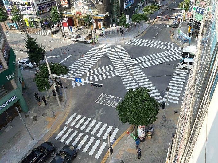 도심 교차로에 흔히 보이는 '직선 횡단보도'는 자동차 중심의 교통흐름에 중점을 두다보니 보행자 대기 시간이 길어지는 불편함이 있었다.