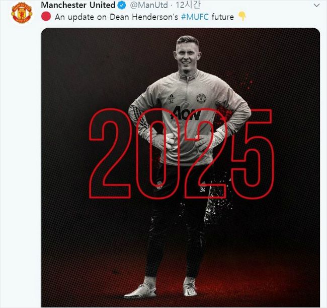 잉글랜드 프리미어리그 맨체스터 유나이티드는 골키퍼 딘 헨더슨과 2025년까지 장기 계약을 맺고 다비드 데 헤아와 주전 경쟁을 예고했다.(사진=맨유 공식 트위터 갈무리)
