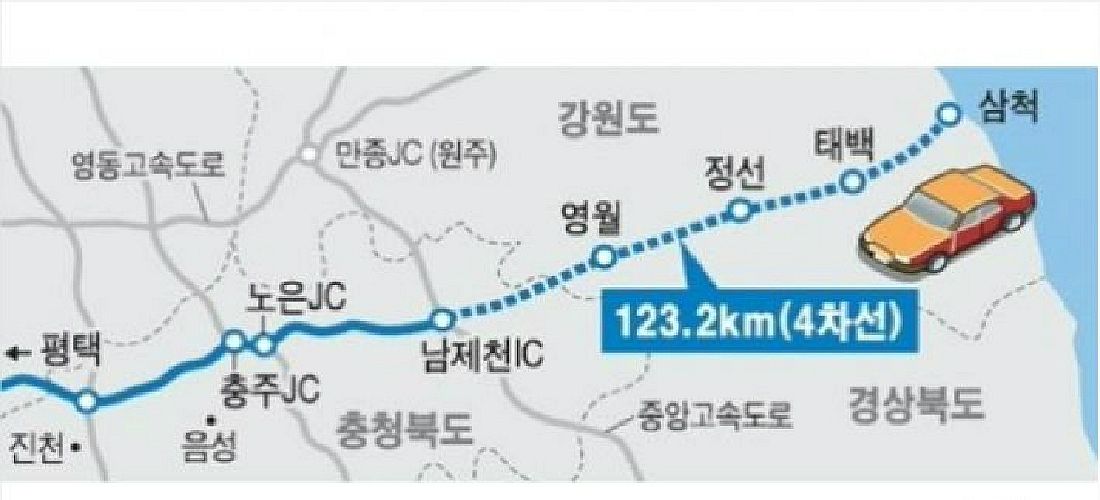 동서고속도로는 경기도 평택과 강원도 삼척을 동서로 연결하는 250㎞ 길이의 고속도로다. 지난 1997년 평택~제천~삼척 동서고속도로 착공 이후 2015년 평택~제천 구간(127.3km)은 완공했다. 하지만 나머지 구간인 제천~삼척 구간(123.2km)은 그동안 경제성 등을 이유로 착공도 하지 못한 채 답보 상태에 머물렀다.