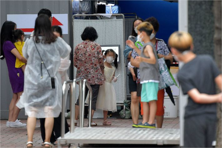 전국 곳곳에서 코로나19가 급격히 확산하면서 신규 확진자 수가 400명대로 급증한 27일 서울 영등포구청에 마련된 선별진료소가 검사를 받으려는 시민들로 붐비고 있다. 박종민기자