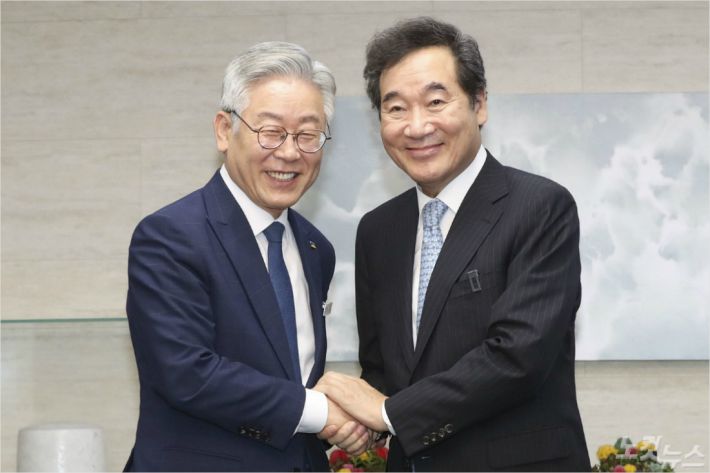 이낙연 더불어민주당 의원(오른쪽)과 이재명 경기도지사가 만나 인사하고 있다. (사진=이한형 기자)