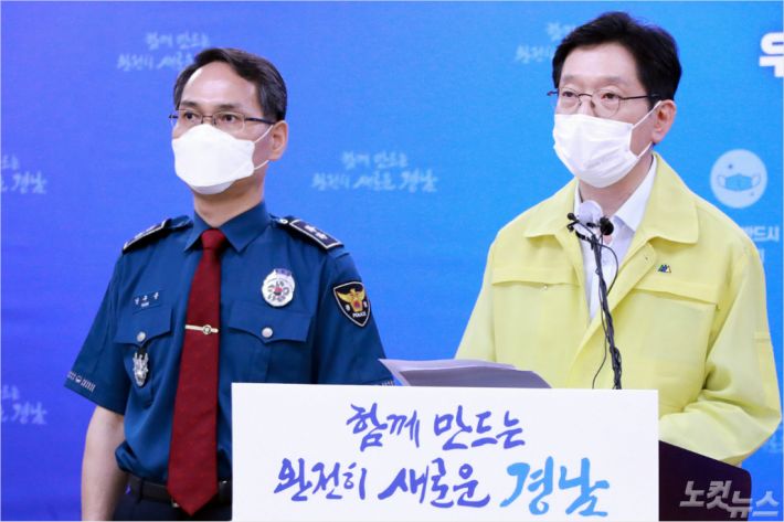 김경수 경남지사와 남구준 경남경찰청장이 기자회견을 하고 있다. (사진=경남도청 제공)