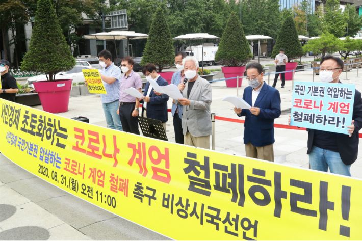 보수 인사들이 모인 '서민경제 초토화하는 코로나계엄 반대 시민비대위'(비대위)는 31일 오전 서울 광화문 광장에서 '서민경제 국민기본권 압살 코로나 계엄 철폐 촉구 시국선언'을 발표하고 "빈대 잡자고 초가삼간 태우는 과잉 방역 중단하라"고 촉구했다.
