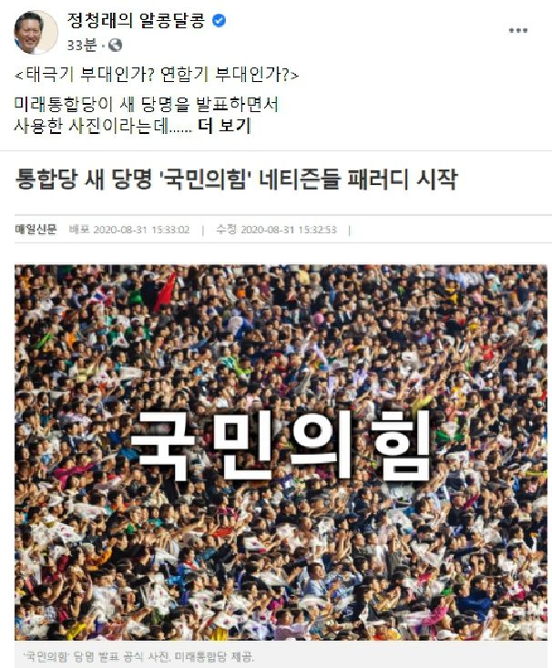 이에 정 의원은 자신의 페이스북에 "명백한 이름 훔치기다. '국민의 힘'이란 이름을 사용하지 말라"고 요구했다.