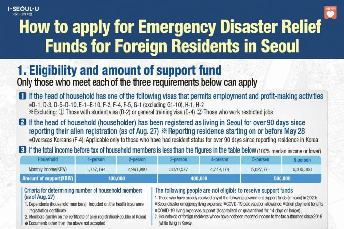 지원 대상은 27일 기준 서울시에 외국인 등록 또는 국내거소 신고를 한 지 92일이 초과된 중위소득 100% 이하 가구로, 취업과 영리활동이 가능해야 한다.
