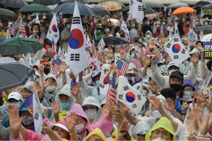 지난 15일 오후 서울 종로구 동화면세점 앞에서 열린 보수단체의 광복절 집회에서 참서자들이 태극기와 성조기를 흔들고 있다.(사진=이한형 기자/자료사진)