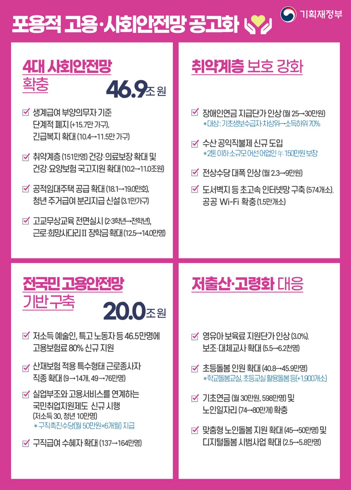 이 가운데 가장 많은 예산이 배정된 프로젝트는 '생계·의료·주거·교육 4대 사회안전망 확충'이다. 10대 중점 프로젝트 전체 예산의 약 30%인 46조 9000억 원이 할당됐다.