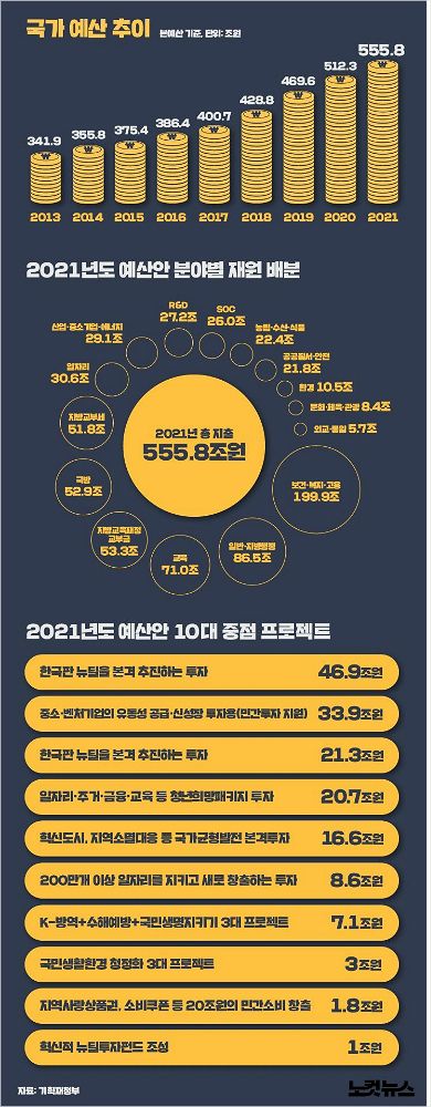 정부는 1일 국무회의에서 의결된 '2021년 예산안'을 편성하면 '한국판 뉴딜 본격 추진' 등 10대 중점 프로젝트를 선정했다.