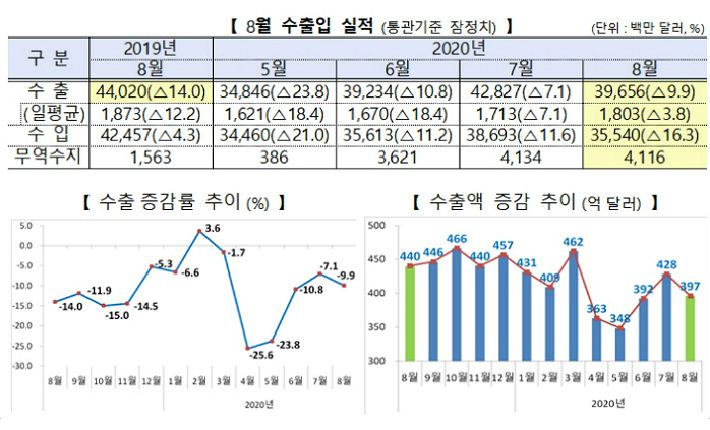 산업부 관계자는 "8월 조업일수가 1.5일 감소했음에도 두 달 연속 한 자릿수 대 감소율을 기록했다"면서 "조업일수 효과를 배제한 하루 평균 수출액은 3.8% 감소를 기록해 코로나19 사태 이후 최소 감소 폭을 기록했다"고 설명했다.