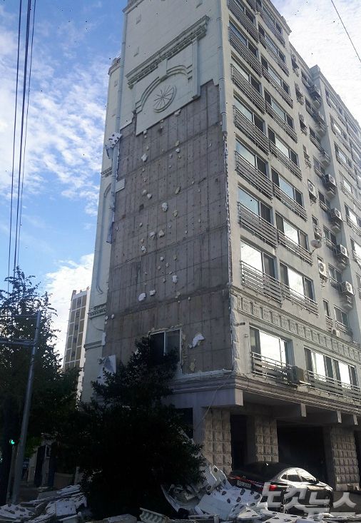 3일 새벽 태풍 마이삭이 강타하면서 울산 남구 신정동의 한 건물 외벽이 떨어져 있다.(사진=반웅규 기자)