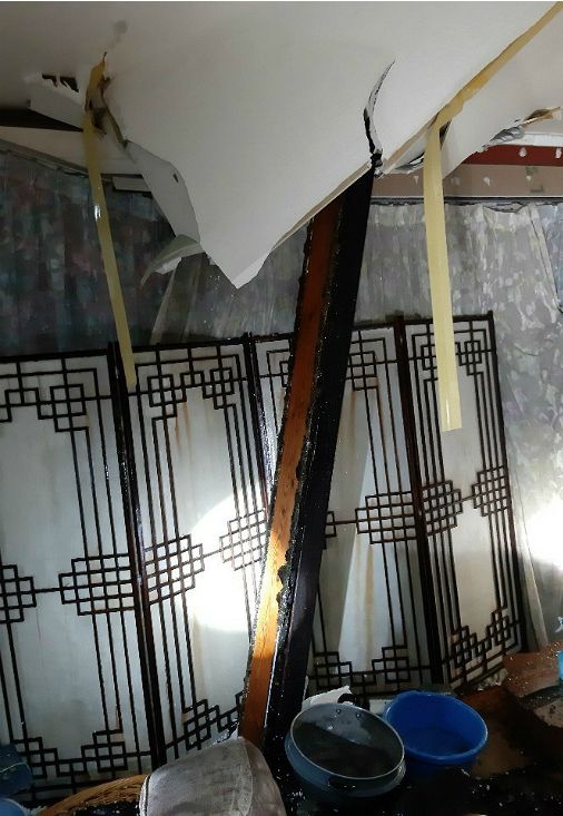 이날 0시 33분쯤 울주군 상북면 궁근정리 한 가정집 지붕이 바람에 날려온 구조물에 의해 파손됐다.