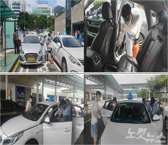 이들은 방역용 고글과 비말차단용 마스크, AP가운, 보호장갑 등을 착용하고 택시 주요 접촉부인 손잡이와 시트 등을 소독한다.