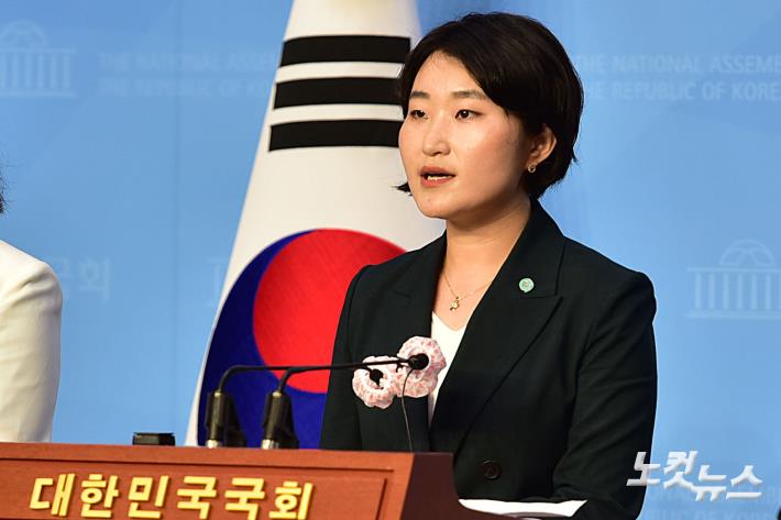 기본소득당 신지혜 대표가 3일 오전 국회 소통관에서 서울시장 보궐선거 출마 기자회견을 하고 있다.