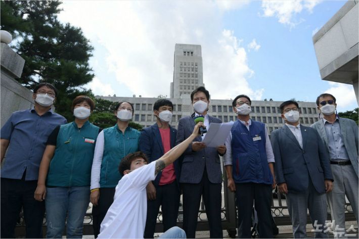 전국교직원노동조합(전교조)의 합법성 여부에 대한 대법원 최종 선고가 내려지는 3일 오후 권정오 전교조 위원장이 서울 서초구 대법원 앞에서 인사말을 하고 있다. (사진=이한형 기자)
