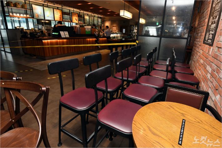 서울 중구 스타벅스 프레스센터점에 좌석 이용 통제선이 설치돼 있다. (사진=황진환 기자/자료사진)