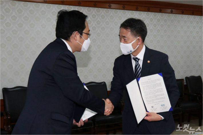 박능후 보건복지부 장관(오른쪽)과 최대집 대한의사협회장이 4일 오후 정부서울청사에서 열린 의·정 협의체 구성 합의서 체결식에 마친 뒤 악수하고 있다.(사진=이한형 기자)