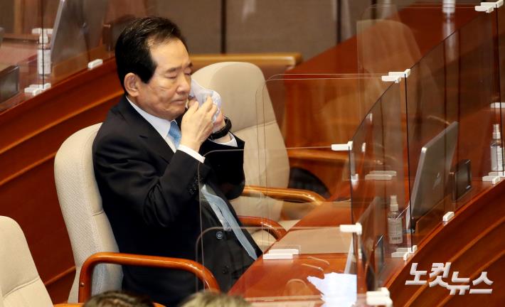 정세균 국무총리가 7일 오전 서울 여의도 국회에서 열린 본회의에 참석해 마스크를 고쳐쓰고 있다.