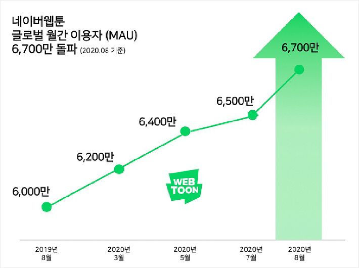 네이버웹툰의 월간 순 사용자(MAU)가 6700만을 돌파했다. 지난 7월 6500만을 넘어선 뒤 한 달만에 200만명이 증가한 것이다.
