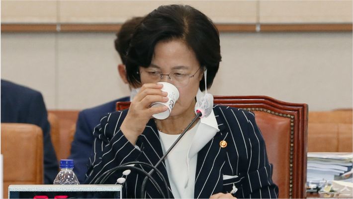 추미애 법무부 장관이 25일 오후 서울 여의도 국회에서 열린 법제사법위원회 전체회의에서 물을 마시고있다. 윤창원기자