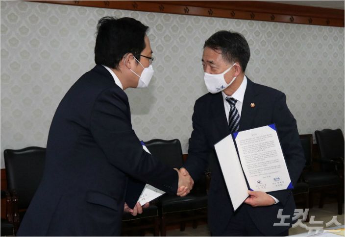박능후 보건복지부 장관(오른쪽)과 최대집 대한의사협회장이 4일 오후 정부서울청사에서 열린 의·정 협의체 구성 합의서 체결식에 마친 뒤 악수하고 있다. 이한형기자