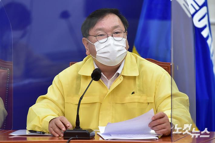 더불어민주당 김태년 원내대표가 9일 오전 국회에서 열린 당 최고위원회의에서 발언을 하고 있다.