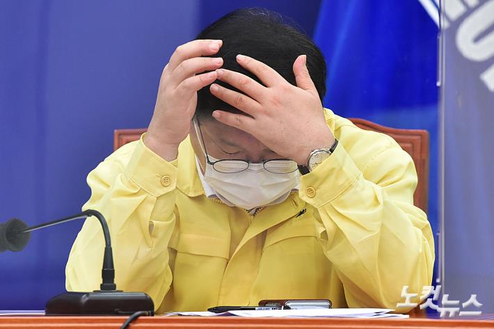 더불어민주당 김태년 원내대표가 9일 오전 국회에서 열린 당 최고위원회의에서 고개를 숙이고 머리를 만지고 있다.