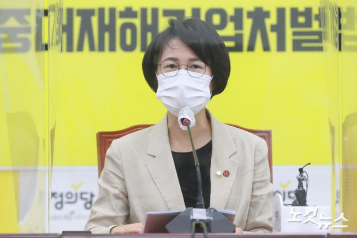 강은미 정의당 신임 원내대표가 9일 오전 서울 여의도 국회에서 열린 의원총회에서 발언을 하고 있다.