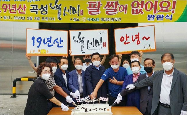 전남 곡성 석곡농협은 지난 9일 곡성 쌀 브랜드인 백세미 방앗간에서 유근기 곡성군수와 조합원이 참석한 가운데 백세미 완판식을 진행했다.(사진=석곡농협 제공)